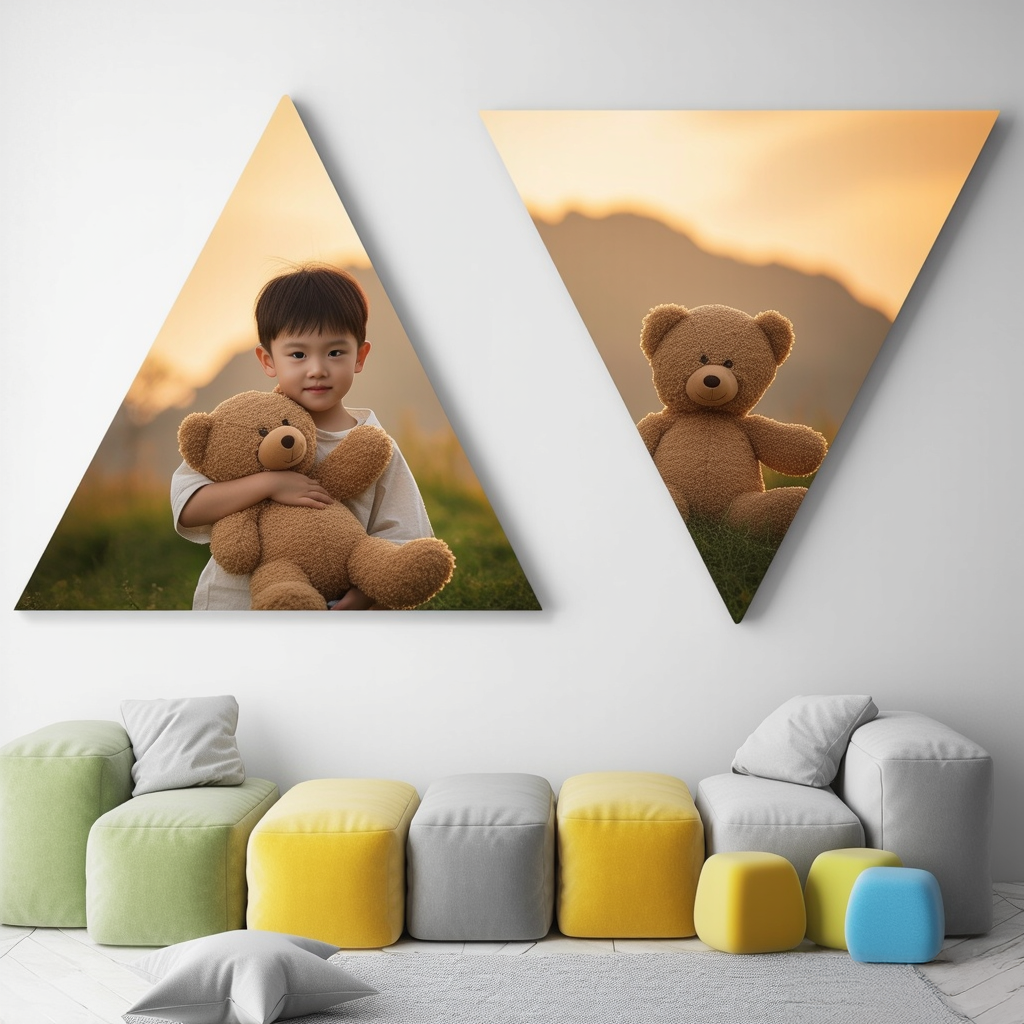 Tedd különlegessé otthonod falát egy páros, egymásra fordított háromszög vászonképpel! Ez a geometrikus elrendezés játékos és modern megjelenést biztosít, miközben kedvenc fotóidat művészien emeli ki. Legyen szó családi pillanatokról, kismama portréról vagy akár egyedi grafikai alkotásról, a háromszög vászonképek minden enteriőrben feltűnő és stílusos dekorációt alkotnak.