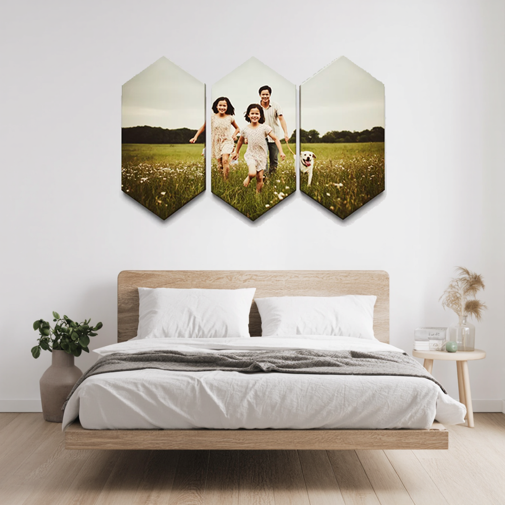 🖼️ Egyedi 3 Részes Nyújtott Hatszög Mozaik Vászonkép – Modern geometria, személyes emlék! 🖼️